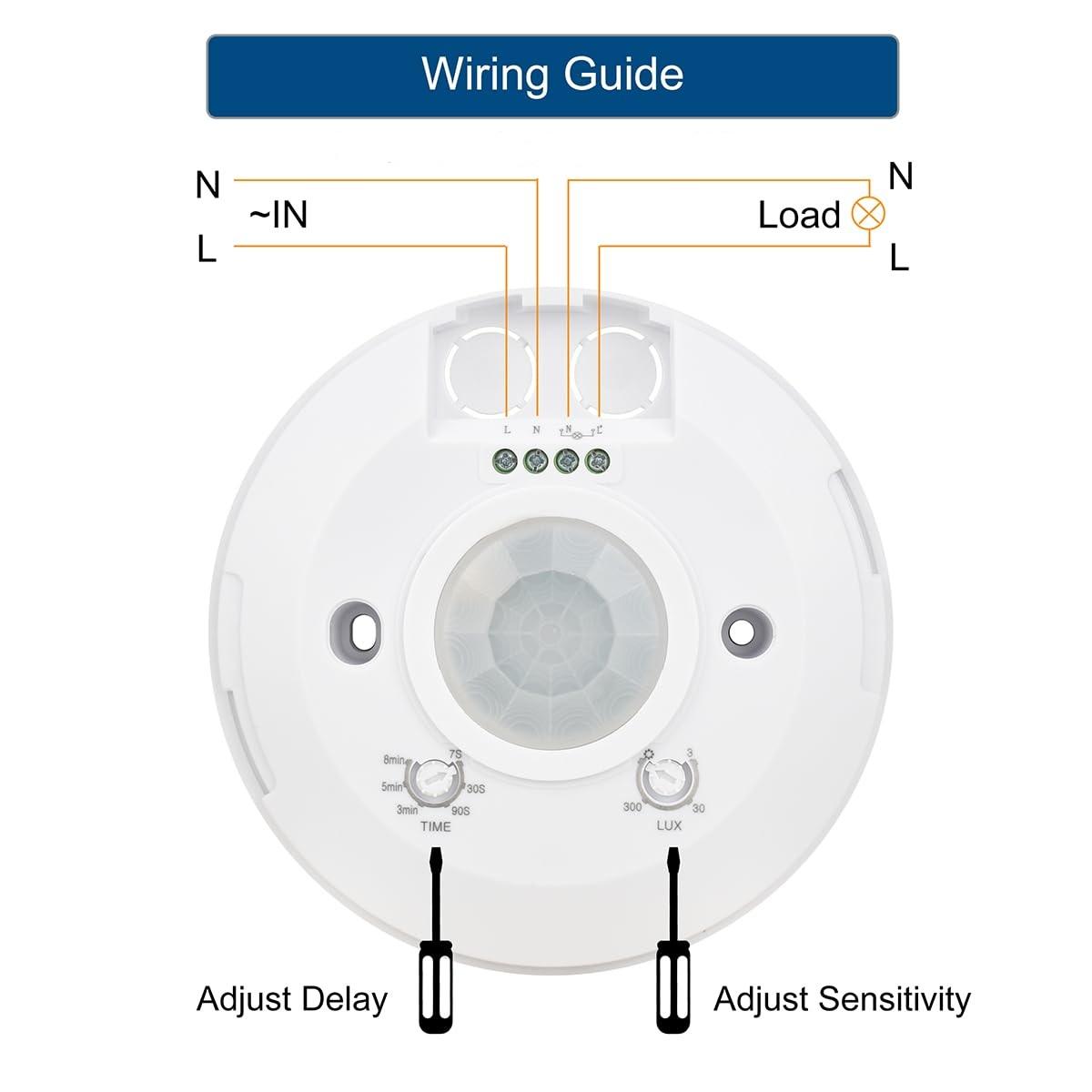 With adjustable time delay and ambient light sensitivity, the sensor ensures reliable motion detection while reducing unnecessary energy consumption.